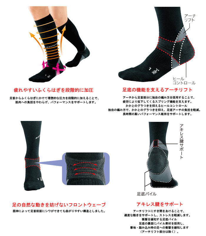 ※お取り寄せ:発送まで1〜5日(土・日・祝日を除く) ※当店とメーカーの在庫を合わせた数を表示しておりますので、まれに欠品が発生する場合もございます着圧機能性ソックスコンプレッションタイプha-1段階的に圧力を加えてふくらはぎをサポート。